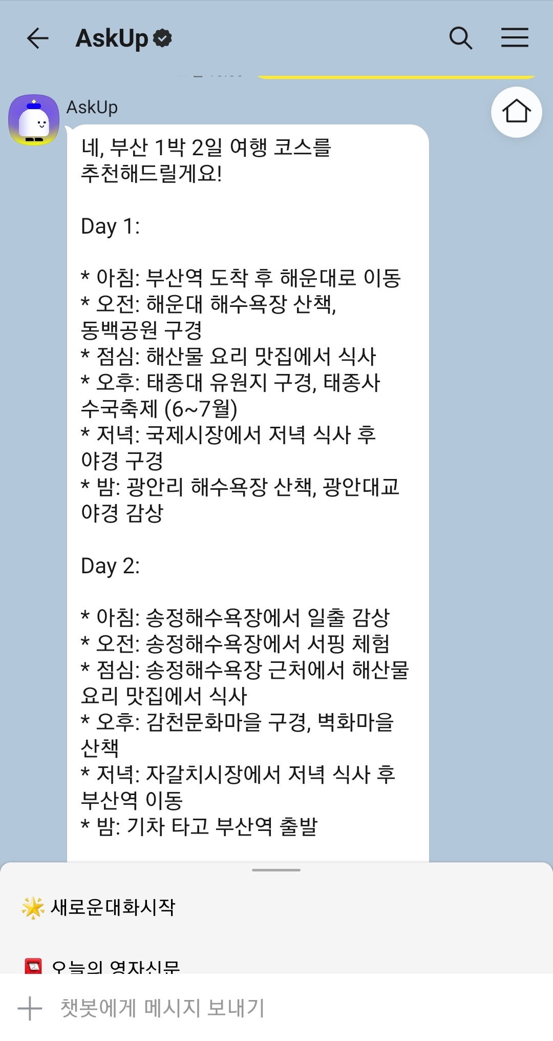 카톡에도 인공지능이 있습니다. 카톡 채널에서 askup을 검색하여 친구 등록한 다음 다양한 질문을 올려보세요. 아래와 같이 챗디피티와 같은 수준으로 질문에 대한 답을 해줍니다.